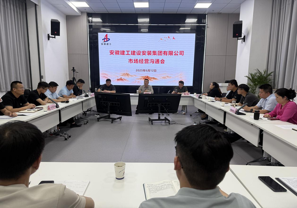 6月12日下午,建工安裝召開市場經營溝通會,公司黨委委員、副總經理劉曉剛、費廣清出席會議,市場開發和投資部經理許杰主持會議。